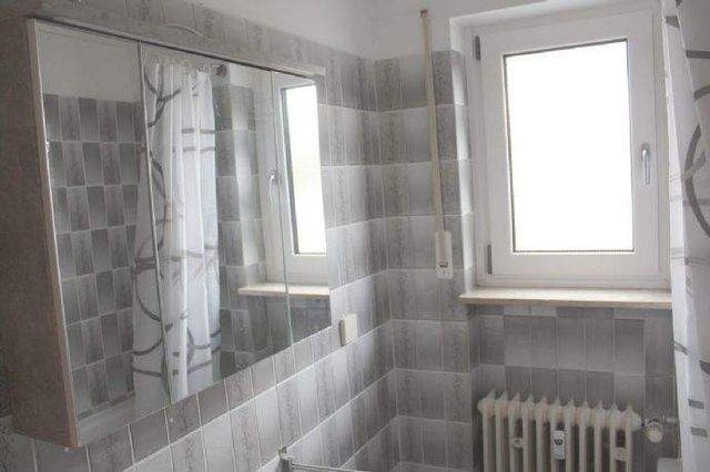 Erdgeschosswohnung im Zweifamilienhaus mit zeitmäßiger und funktioneller Ausstattung Bad hellgrau gefliest mit Wandspiegelschrank